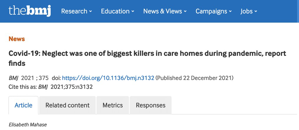 W wielu przypadkach pensjonariusze domów opieki zostali porzuceni przez personel w następstwie celowo wywołanej paniki i, co zbiegło się w czasie z całkowitą blokadą odwiedzających, pozostawieni na pewną śmierć z powodu braku pożywienia i wody oraz podstawowej opieki, w izolacji, przyczyniając się do iluzji “pandemii” spowodowanej przez “covid “5.