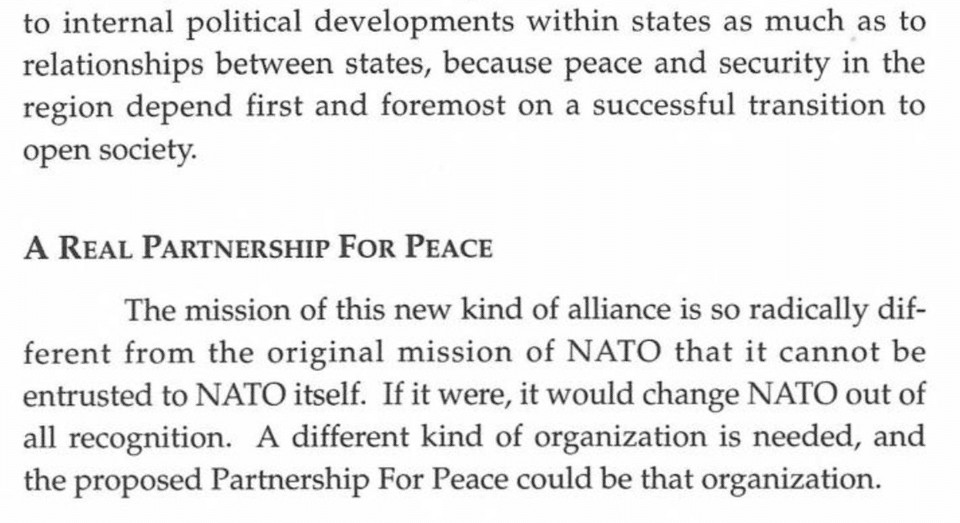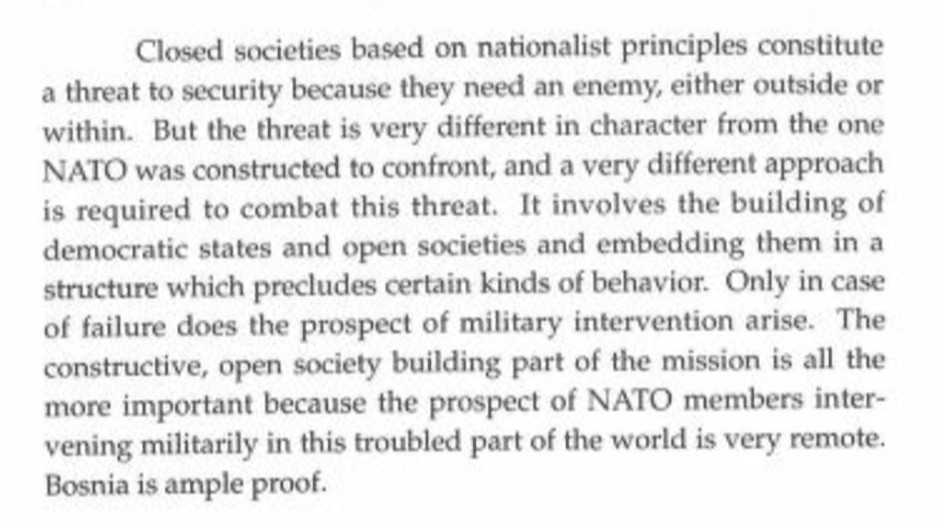 Esej przedstawia nową misję NATO po zakończeniu zimnej wojny. NATO nie byłoby już sojuszem obronnym przeciwko Rosji – to przestarzałe. Zamiast tego, miałoby proaktywnie wychodzić i kształtować inne państwa w kierunku “otwartych społeczeństw”.