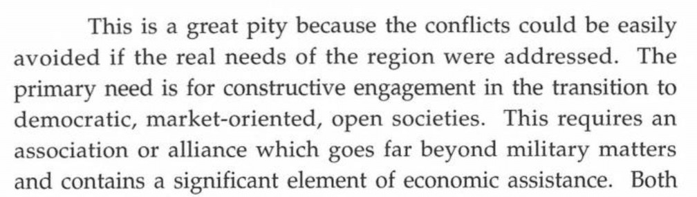 Innymi słowy, nowa misja NATO: jeśli jakieś państwo nie przyjmuje kapitalizmu i liberalizmu w stylu zachodnim, NATO powinno wkroczyć… politycznie, ekonomicznie i ostatecznie militarnie.