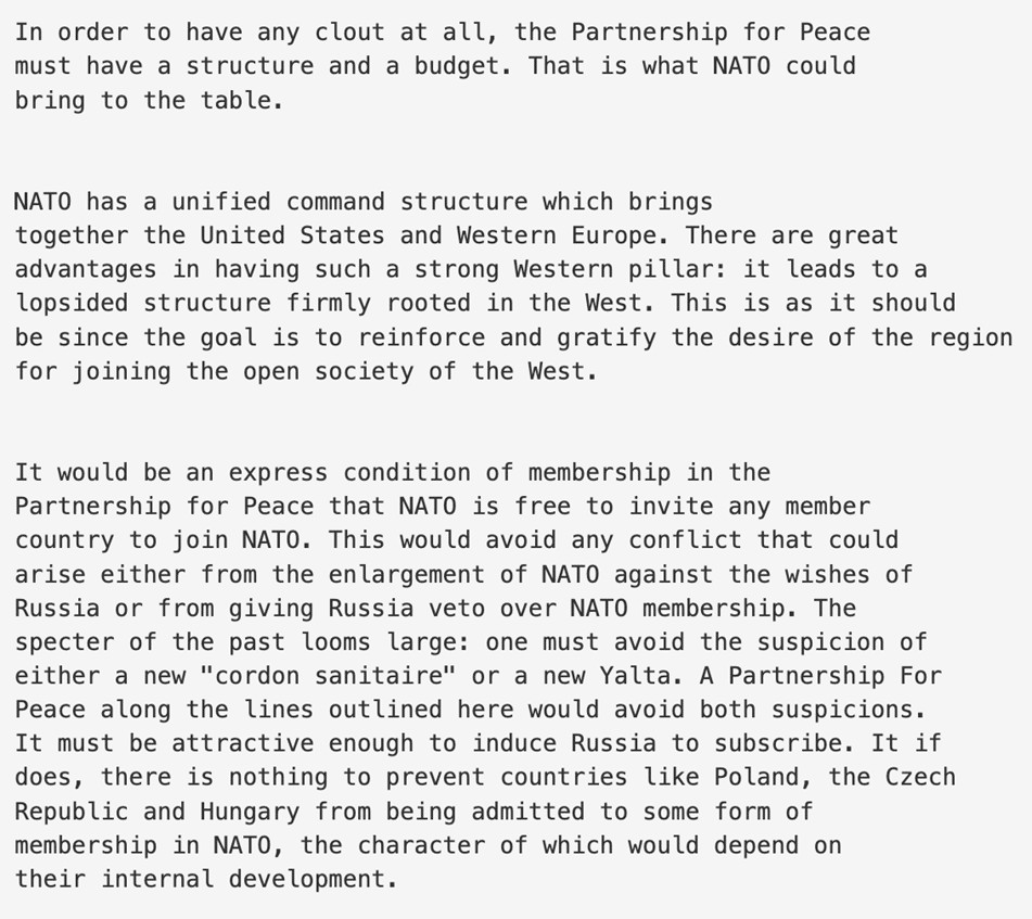 Tłumaczenie: Nowym zadaniem NATO nie jest obrona państw członkowskich, ale rozszerzanie swojej obecności na wschód i aktywne kształtowanie polityki wewnętrznej sąsiednich państw, zwłaszcza bloku postsowieckiego.