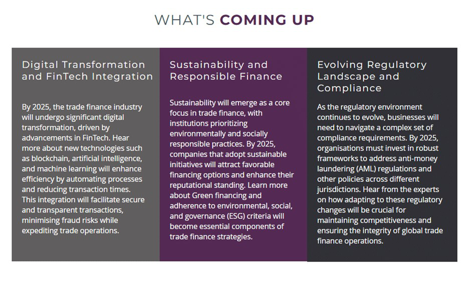 Global Trade Finance Expo 2025 odbędzie się w listopadzie. Kluczowe tematy do omówienia obejmują blockchain, sztuczną inteligencję (“AI”), kryteria środowiskowe, społeczne i ładu korporacyjnego (“ESG”), odporność łańcucha dostaw, cyberbezpieczeństwo i płatności cyfrowe.