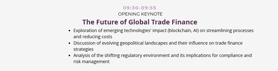 Global Trade Finance Expo ma na celu zgromadzenie decydentów wyższego szczebla z banków, handlowców, eksporterów, korporacji, ubezpieczycieli, agencji kredytów eksportowych i instytucji finansowania rozwoju w celu wspierania współpracy i wymiany wiedzy.