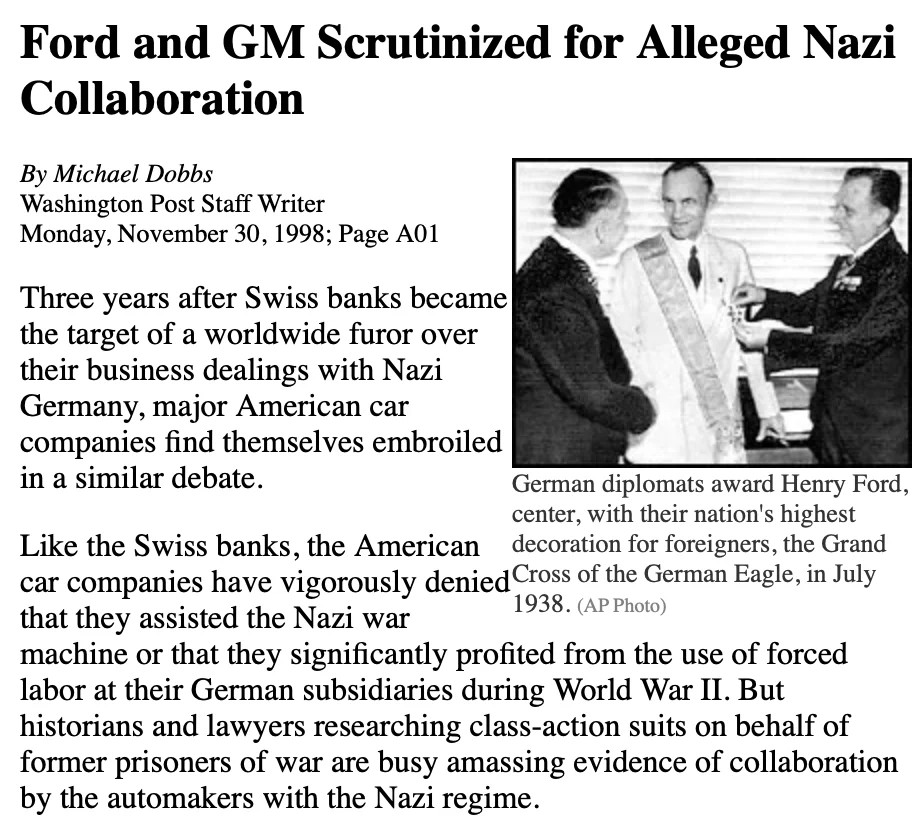 … W niektórych przypadkach amerykańscy menedżerowie zarówno GM, jak i Forda zgodzili się na przekształcenie swoich niemieckich zakładów w zakłady produkujące na potrzeby wojska w czasie, gdy dokumenty rządowe USA wskazują, że nadal opierali się oni wezwaniom administracji Roosevelta do zwiększenia produkcji wojskowej w swoich zakładach w kraju. (Washington Post, 30 listopada 1998 r.)