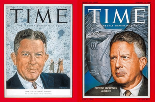 Oto dwie okładki magazynu Time: jedna przedstawia Neila McElroya z Proctor & Gamble, a druga Neila McElroya, sekretarza obrony.