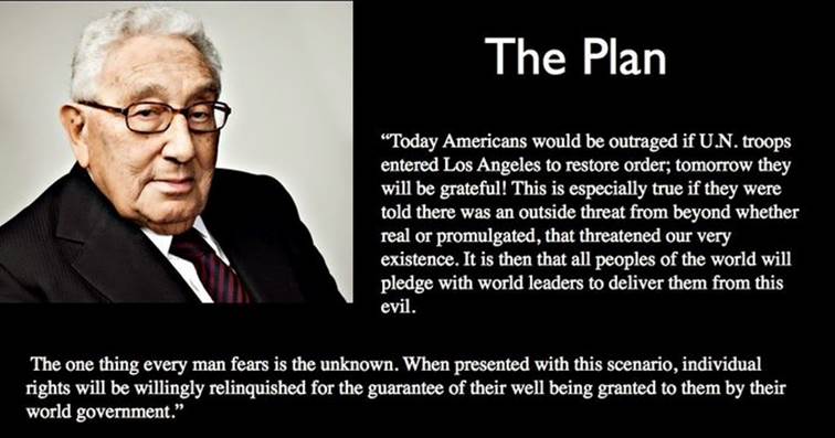 “Dziś Amerykanie byliby oburzeni, gdyby wojska ONZ wkroczyły do Los Angeles, aby przywrócić porządek; Jutro będą wdzięczni! Jest to szczególnie prawdziwe, jeśli powiedziano im, że istnieje zewnętrzne zagrożenie z zewnątrz, czy to realne, czy ogłoszone, które zagraża naszemu istnieniu. To właśnie wtedy wszystkie narody świata złożą zobowiązanie wobec światowych przywódców, że uwolnią ich od tego zła.
