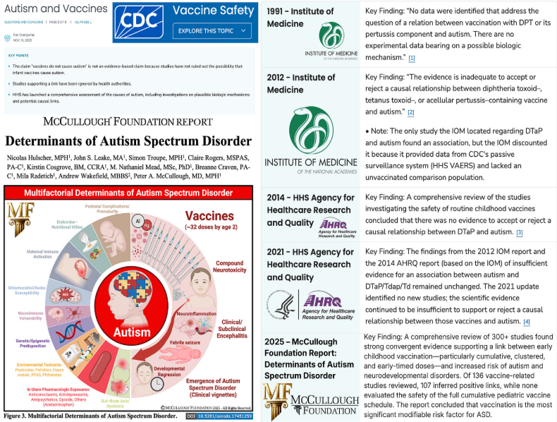Wywiad przechodzi od kryzysu COVID do ponownej oceny całego programu szczepień dzieci, który według McCullougha opiera się na tych samych błędnych założeniach. Nawiązuje do raportu Fundacji McCullougha z 2025 r. przedłożonego HHS i Białemu Domowi, w którym wskazano szczepionki skojarzone jako istotny czynnik ryzyka autyzmu, obok wieku rodziców, przedwczesnego porodu i okołoporodowego narażenia na leki.