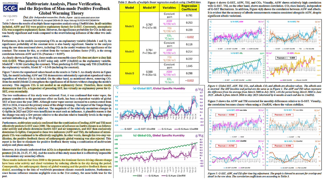 Nowa analiza systematyczna przeprowadzona przez niezależnego japońskiego badacza Dai Ato, opublikowana pod tytułem „Multivariate Analysis, Phase Verification, and the Rejection of Man-made Positive Feedback Global Warming Theory” w czasopiśmie naukowym „Science of Climate Change”, pokazuje, że to nie dwutlenek węgla, potępiany przez fanatyków klimatu, wpływa na temperatury, ale raczej całkowicie naturalne czynniki, takie jak nasłonecznienie naszej planety.