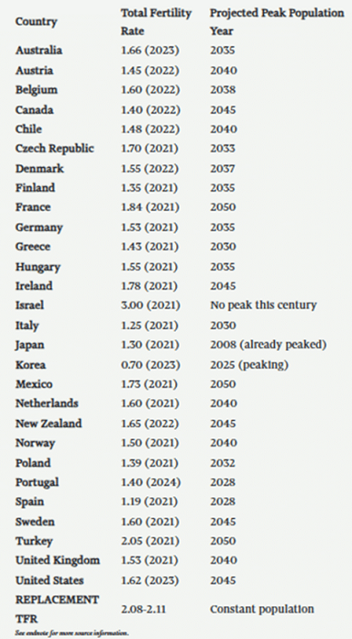 Lata szczytu populacji opierają się na prognozach ONZ World Population Prospects (PDF) dotyczących wariantów pośrednich, popartych raportami regionalnymi zauważającymi, że większość krajów Europy i Ameryki Północnej osiągnie szczyt pod koniec lat 30. Japonia osiągnęła szczyt już około 2008 r., Korea Południowa około 2025 r., a Izrael – z całkowitym współczynnikiem dzietności (“TFR”) bliskim 3,0 – może nie osiągnąć szczytu w tym stuleciu.
