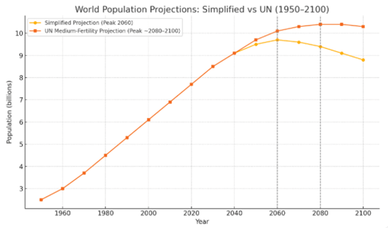 Nasuwa się więc pytanie: jeśli wszystkie te kraje mają TFR poniżej zastępowalności pokoleń, to co tak naprawdę dzieje się z populacją świata? Odpowiedź jest prosta, choć nie mówi się o niej zbyt wiele. Światowa populacja osiągnie szczyt, a następnie zacznie spadać. Całkowita liczba ludzi na Ziemi zacznie spadać w niedalekiej przyszłości. Rzeczywista data szczytu jest kwestią domysłów, ponieważ zależy od konkretnych założeń, ale szacunki wydają się w większości mieścić między 2060 r. (zakładając, że obecne TFR są stałe) a 2080 r. (jeśli TFR nieznacznie wzrosną, a długość życia wzrośnie):