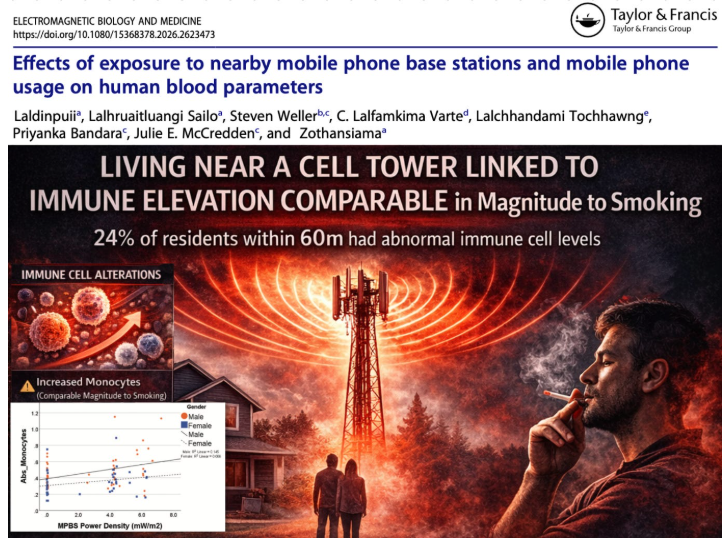 W nowo opublikowanym, zrecenzowanym badaniu przeanalizowano osoby mieszkające w odległości do 60 metrów od stacji bazowych telefonii komórkowej i porównano je z mieszkańcami mieszkającymi w odległości ponad 300 metrów. Naukowcy nie pytali o bóle głowy ani zaburzenia snu. Pobrali krew. Zmierzyli gęstość mocy wewnątrz domów uczestników. Przeprowadzili pełną morfologię krwi i przeanalizowali podgrupy komórek odpornościowych. A to, co odkryli, nie było subtelne.