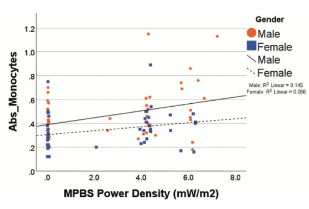 Dane wykazały, że większa gęstość mocy RF w domu z pobliskich stacji bazowych była istotnie powiązana z większą całkowitą liczbą leukocytów, a także podwyższoną liczbą bazofilów i monocytów.