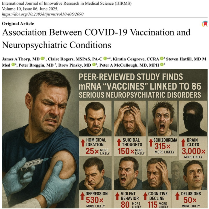 Niepokojące jest to, że od 2021 roku ponad 70% ludzkości otrzymało środek neurotoksyczny udający szczepionkę “”. Te same cele, które określono w dokumencie CIA (szczepionki/leki mogące potajemnie wywoływać lęk, depresję i letarg) są obecnie obserwowane w populacjach zaszczepionych przeciwko COVID-19.