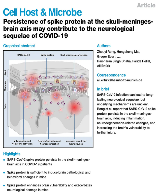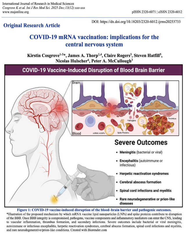 Wydaje się, że zastrzyki mRNA zakłócają barierę krew–mózg, umożliwiając mRNA, białkom kolczastym amyloidogennym i patogenom przenikanie do mózgu i rdzenia kręgowego —, co jest wynikiem zgodnym z obecnie rosnącym tempem pogorszenia funkcji poznawczych.