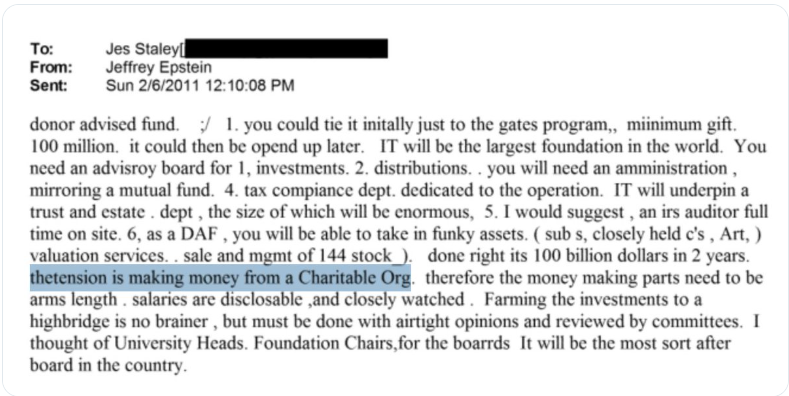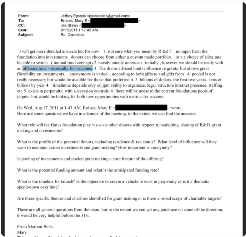 W sierpniu 2011 r. Jeffrey Epstein wysłał e-mail do Mary Erdoes — dyrektor generalnej działu zarządzania aktywami JPMorgan o wartości $2 BILIONÓW —, w którym przedstawił fundusz doradzany przez darczyńców powiązany z Gatesem.