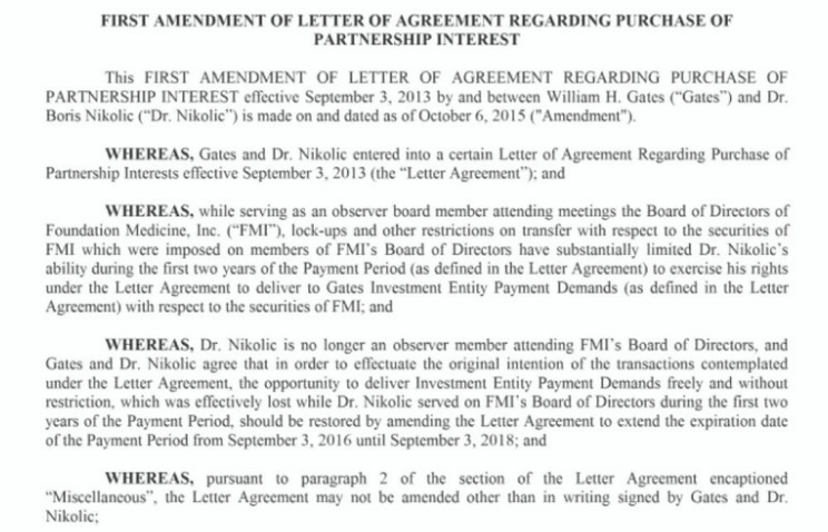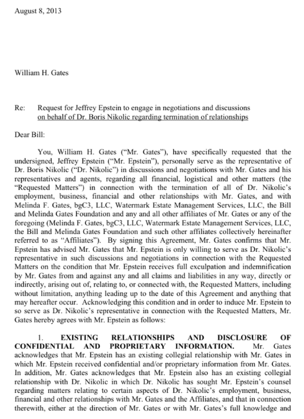 W liście porozumienia skierowanym do Williama H. Gatesa stwierdzono, że Gates „konkretnie poprosił” Jeffreya Epsteina, aby „osobiście pełnił funkcję przedstawiciela” Borisa Nikolica.