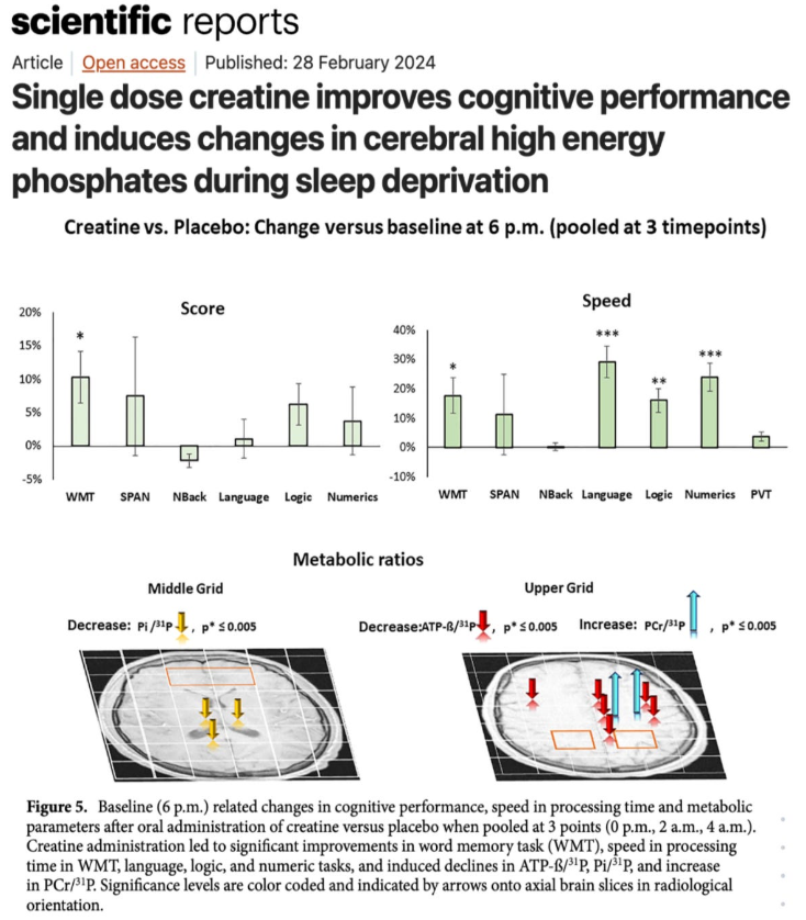 Podsumowując, pojedyncza dawka kreatyny wynosząca ~20 g szybko wzmocniła bioenergetykę mózgu i znacząco poprawiła sprawność poznawczą podczas braku snu, a efekty utrzymywały się do dziewięciu godzin.