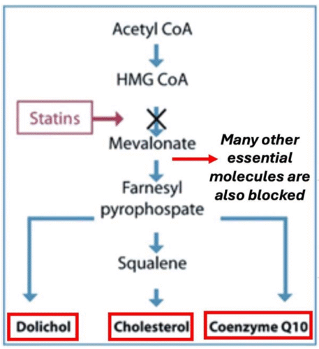 Uwaga: Wiele problemów wynika również z innych biomolekuł, których produkcja wpływa przez statyny (np. białko tau, selenoproteiny lub dolichol).