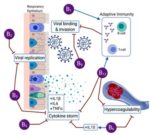 Witaminy B1, B2, B3, B5, B6, B9 i B12 mogą wpływać na kilka procesów chorobowych specyficznych dla COVID-19, w tym replikację i inwazję wirusa, indukcję burzy cytokinowej, odporność adaptacyjną i nadkrzepliwość.13 Na poniższym wykresie można zobaczyć, które witaminy z grupy B biorą udział w każdym z tych procesów.